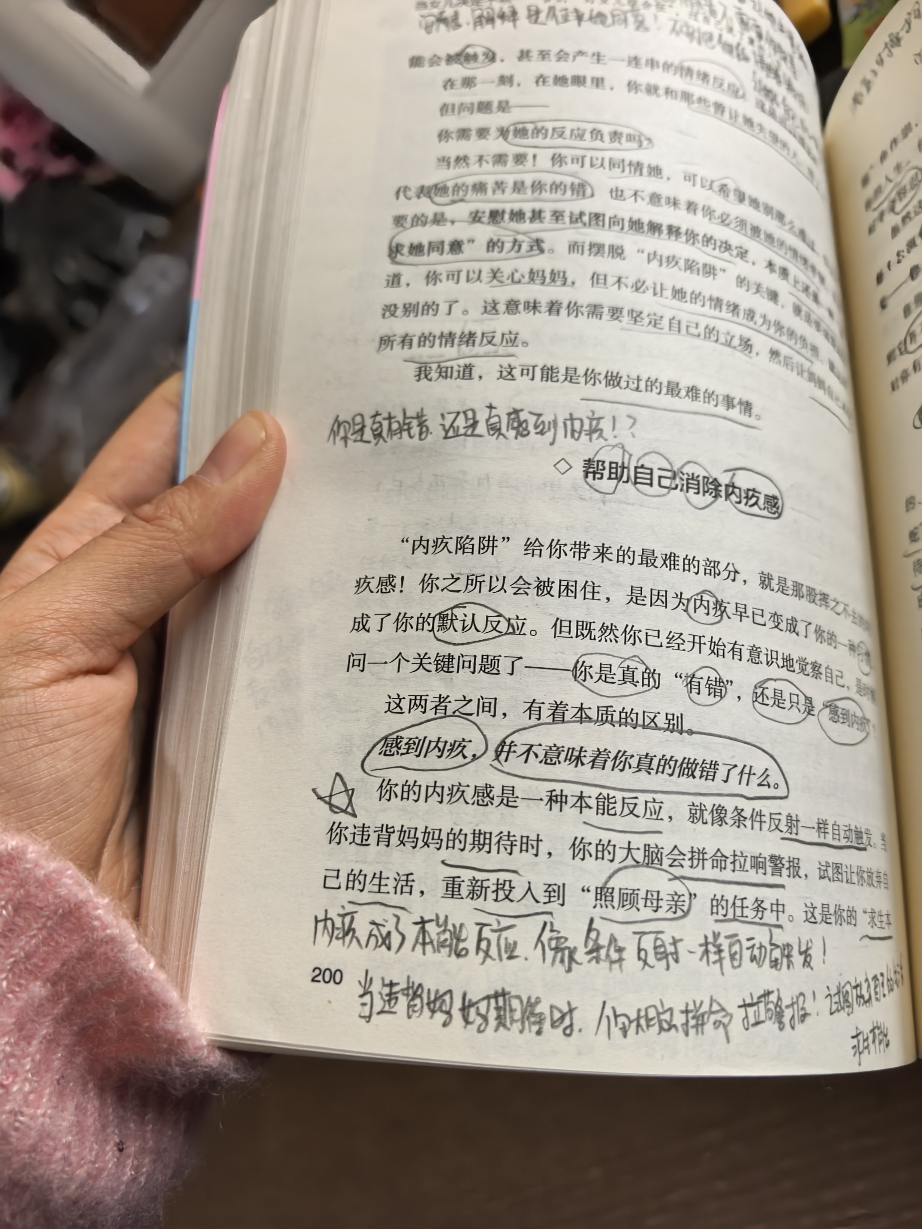 感到内疚并不意味着你真的做错了什么你的内疚感是一种本能的反应,就像条件反射一样自动触发。当你违背妈妈的期待时,你的大脑会拼命拉响警报试图让你放弃自己的生活,重新投入到照顾母亲的任务中。这是你的求生本能。在作祟,而你需要做的是不让这种潜意识里的反应继续操纵你的人生,你需要以一种更理性的方式来评估自己的内疚感。同时学会忍受这种膝跳反射般的情绪,而不是盲目的相信他虽然这种感觉让你很不舒服但你能感受这股内疚感他就越不会演变成吞噬你的巨大罪恶感为什么因为这本来就是个错觉你一直误认为把自己放在第1位是自私的当你真正经历过一次次挑战过这种虚假的负罪感并亲眼看到他并不会。