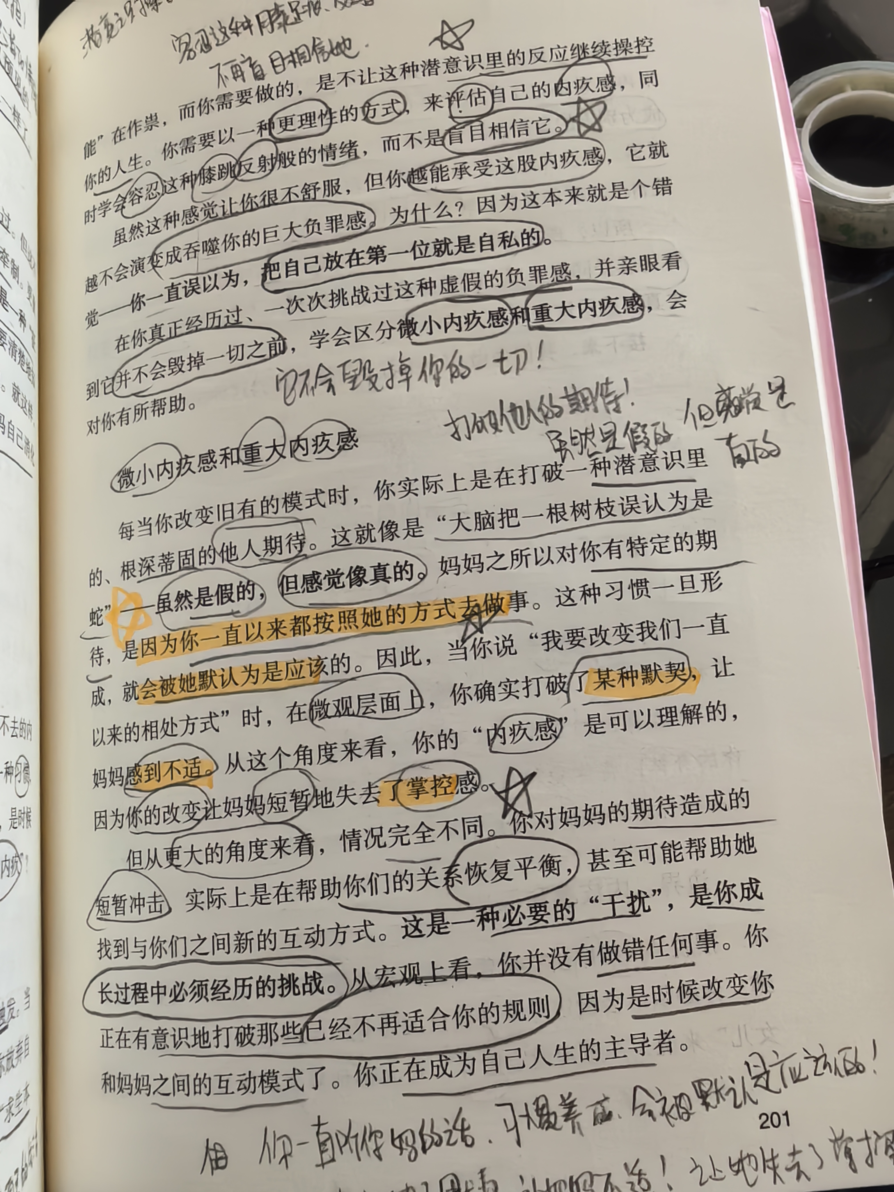 每当你改变旧有的模式时,你实际上是在打破一种潜意识里的根深蒂固的他人期待。这就像大脑把一根树枝误认为事实。虽然是假的,但感觉是真的。妈妈之所以对你有特定的期待,是因为你一直以来都按照他的方式去做事这种习惯一旦形成就会被他默认为是应该的,因此当你说我要改变我们一直以来的相处方式是在微观层面上你确实打破了这种默契某种默契让妈妈感到不适应。从这个角度上来说,你的内疚感是可以理解的,因为你的改变让妈妈短暂的失去了掌控感但从更大的角度来看情况完全不同你对妈妈的期待造成的短暂冲击实际上是帮助你们关系恢复平衡甚至可能帮助他找到与你们之间新的互动方式这是一种必要的干扰是你成长过程中必须经历的挑战。从宏观上看,你并没有做错任何事,你正在有意识地打破那些不再适合你的规则,因为是时候改变你和妈妈之间相互动的模式了,你正在成为自己人生的主导者。