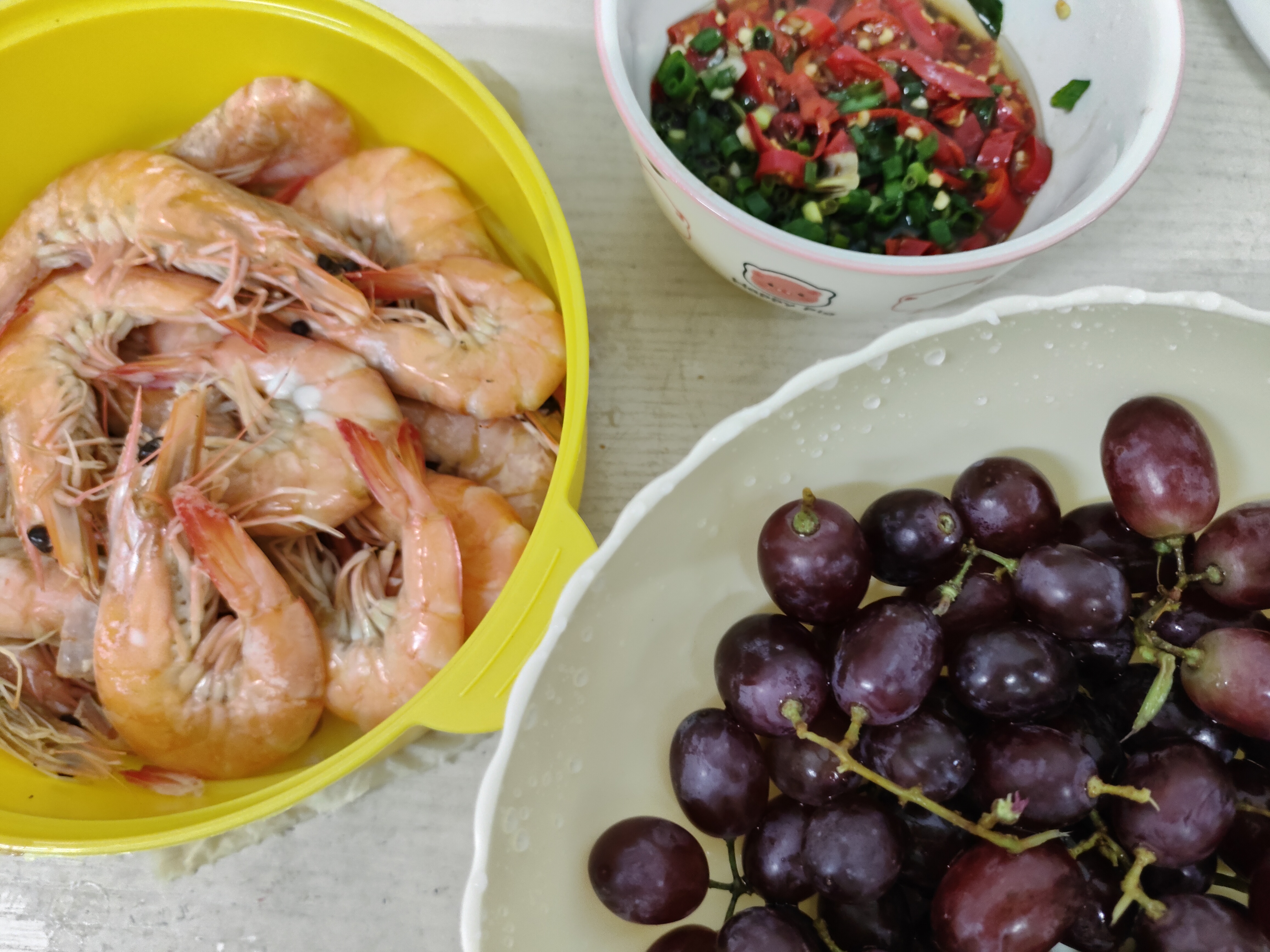家人们,听有一个姐姐说的,我把我做的菜发出来,嘿嘿罒ω罒,我的虾子啊,快进我肚子里趴,嘿嘿`(*∩_∩*)′;我的葡萄也挺甜的