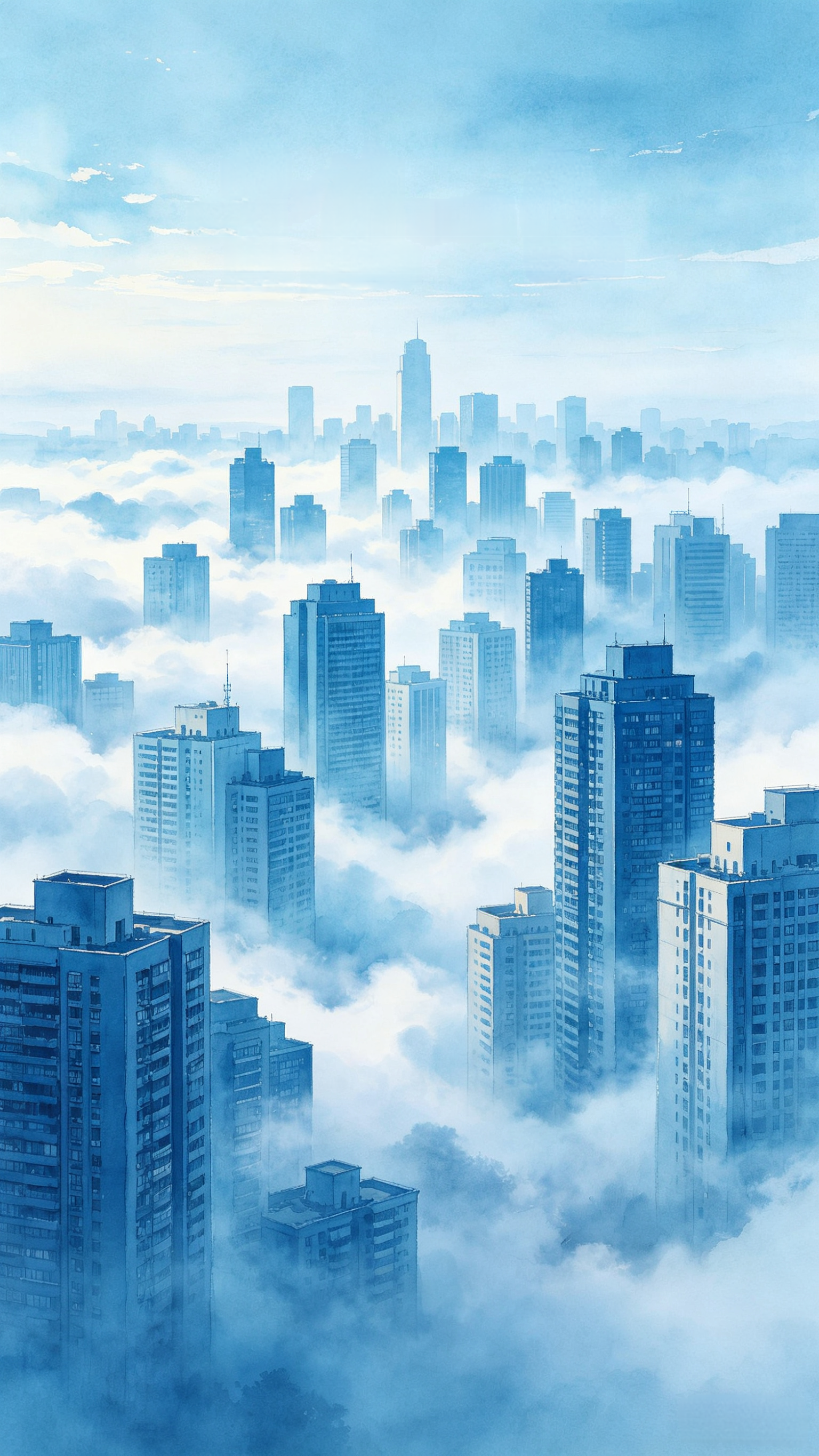 眼前,前面些,有些距离又像在眼前,慢慢前后左右同时升起一排排一幢幢高楼大厦,像是离天空很近,云雾缭绕,天空,云雾,高楼成一色,青蓝色的,看去有些气势磅礴,恬静清雅。